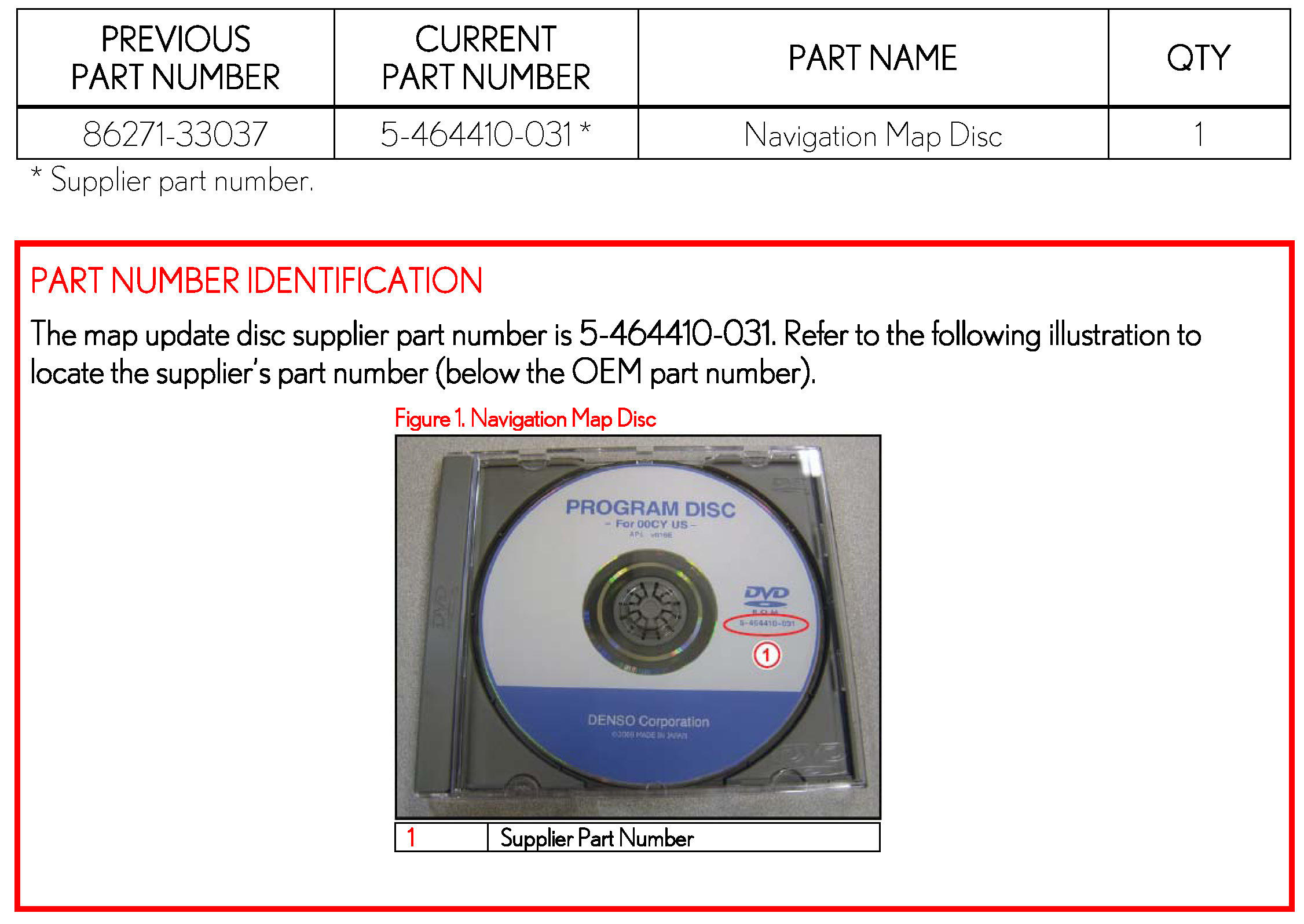 1. Order a map disc through DENSO by calling 1-866-729-3626. Provide DENSO this TSB reference number, dealer code, and vehicle information when ordering this special map disc.