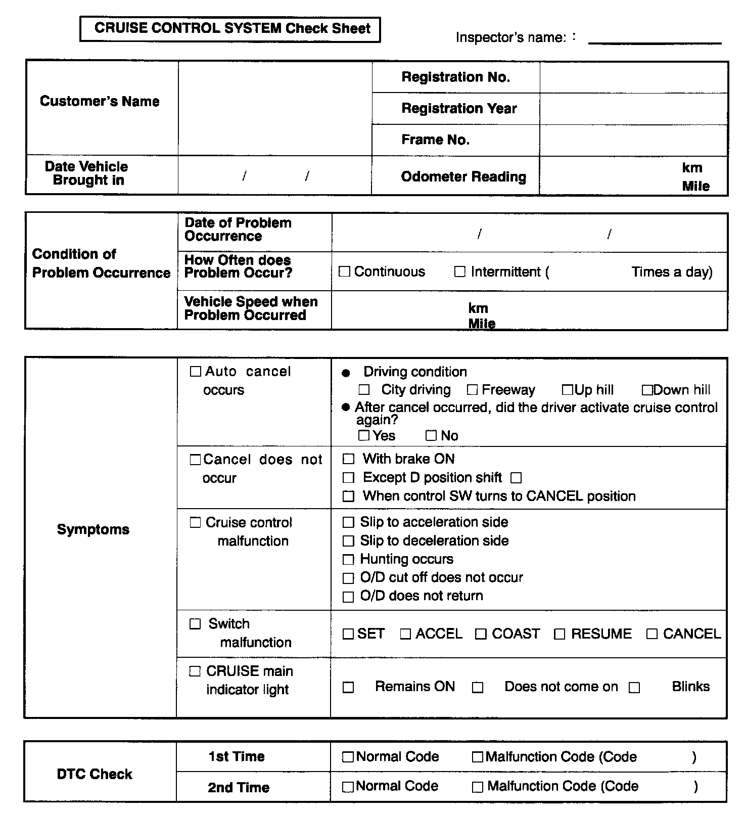 Cruise Control System Check Sheet: