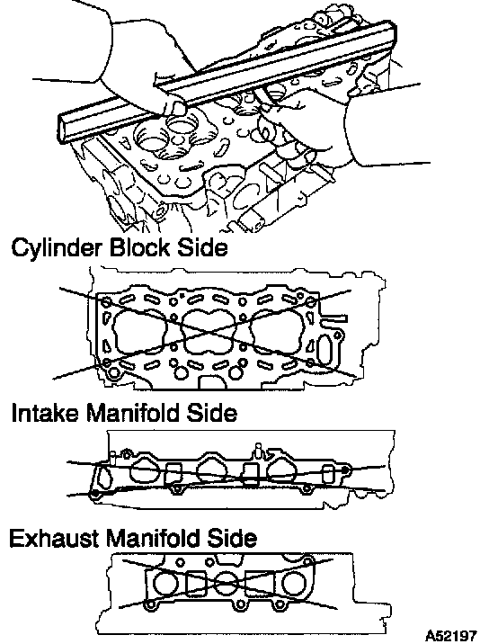 a. Using a precision straight edge and a feeler gauge, measure the surface contacting the cylinder block and the manifolds for warpage.
