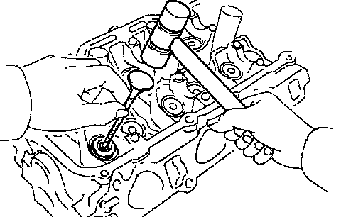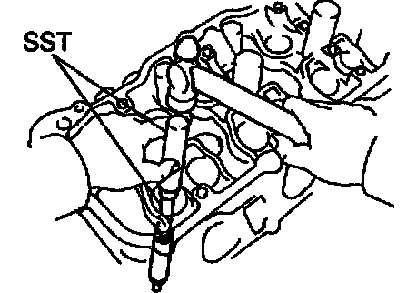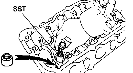 b. Using SST, compress the valve spring and place the 2 keepers around the valve stem.