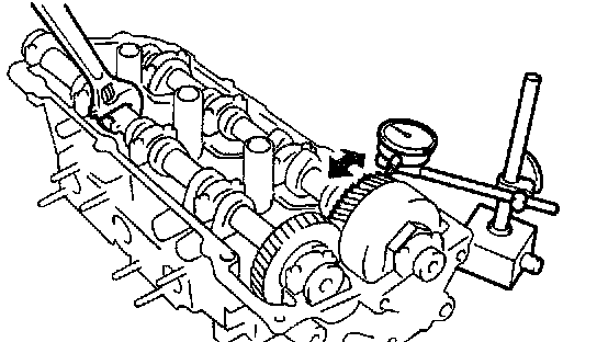 b. Using a dial indicator, measure the thrust clearance while moving the camshaft back and forth.