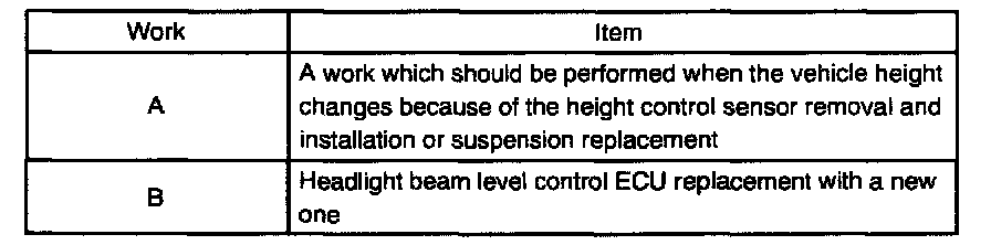 1. Initializing the headlight beam level control ECU would be required after work such as items shown in the chart.