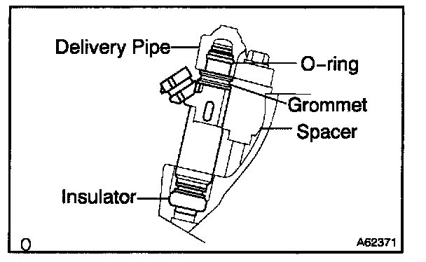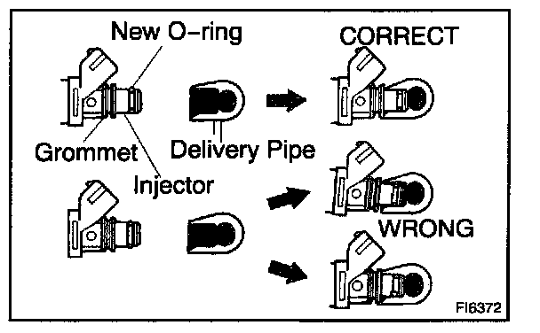 c. Install the injector to the delivery pipe and intake manifold, as shown in the illustration. Before installing the injector, be sure to apply spindle oil or gasoline on the place where a delivery pipe or an intake manifold touches an O-ring of the injector.