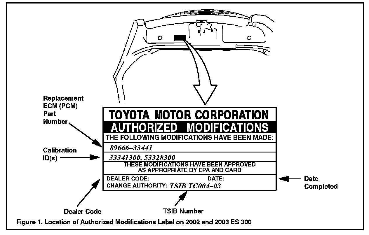 ^ 2002 model year ES 300 vehicles, which have been flash reprogrammed using the procedures in this TSIB, will contain upgraded 2003 model year OBD Illogic. Refer to the 2003 model year ES 300 Repair Manual information on the Technical Information System (TIS) when checking Powertrain Diagnostic Trouble Codes (DTCs) on 2002 model year vehicles that have been reprogrammed.