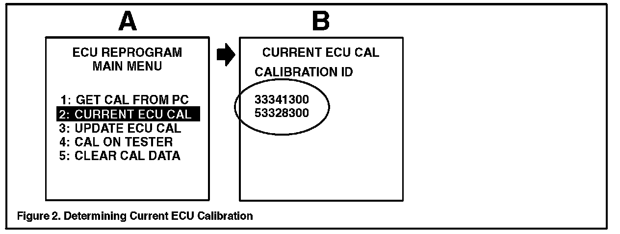 2. Connect the Diagnostic Tester to the vehicle and select CURRENT ECU CAL from the ECU REPROGRAM MAIN MENU. Determine the vehicle's current ECU calibration (see Figure 2).