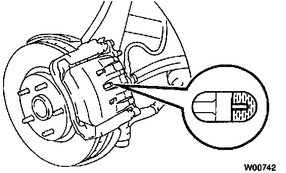Check the pad thickness through the caliper inspection hole and replace the pads if they are not within the specification.