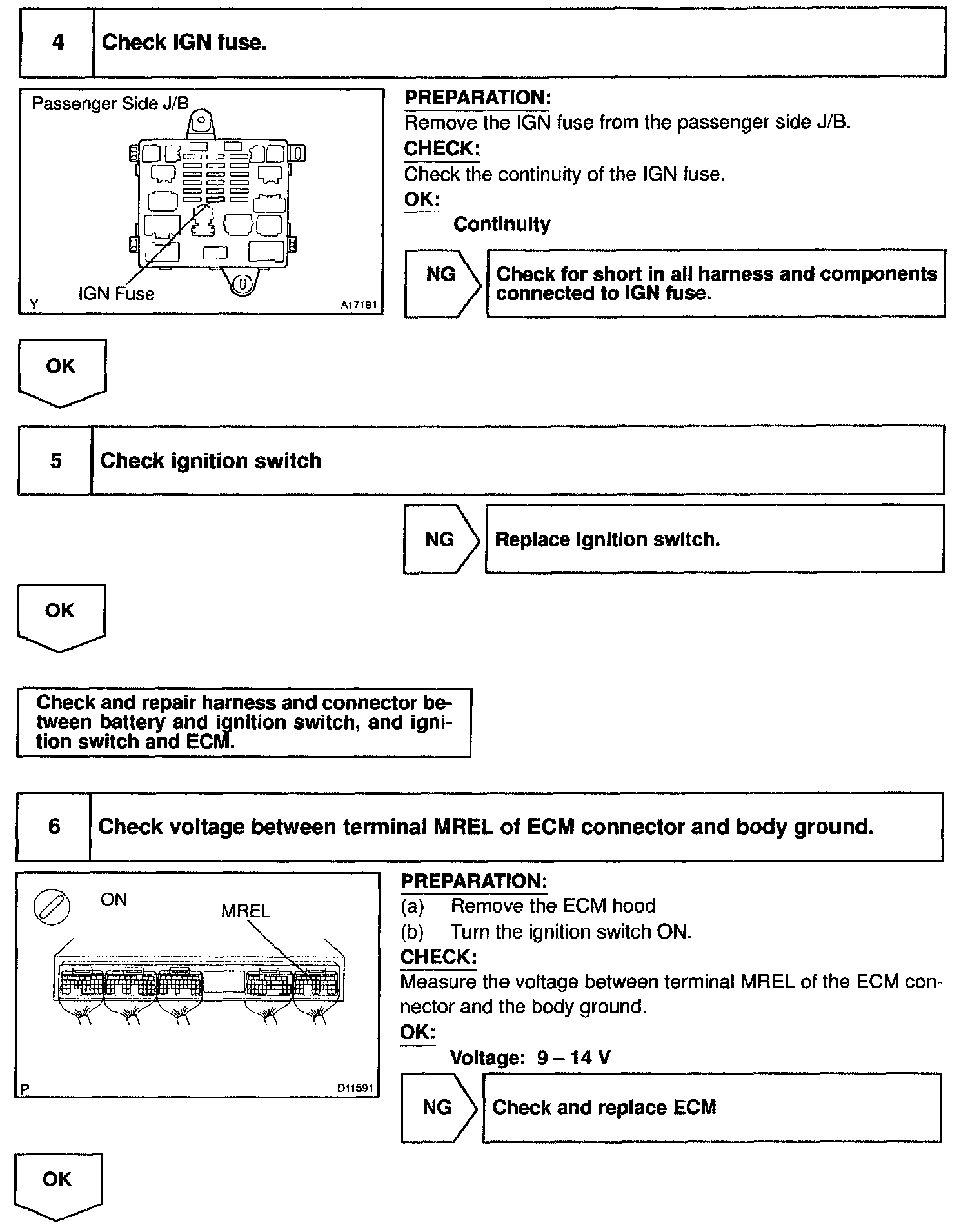 This signal causes current to flow to the coil, closing the contacts of the EFI main relay and supplying power to terminals +B and B2 of the ECM.