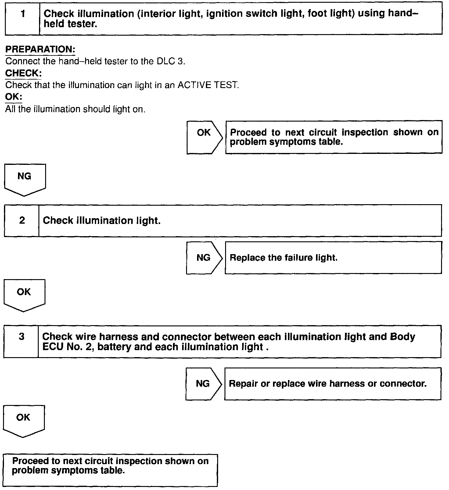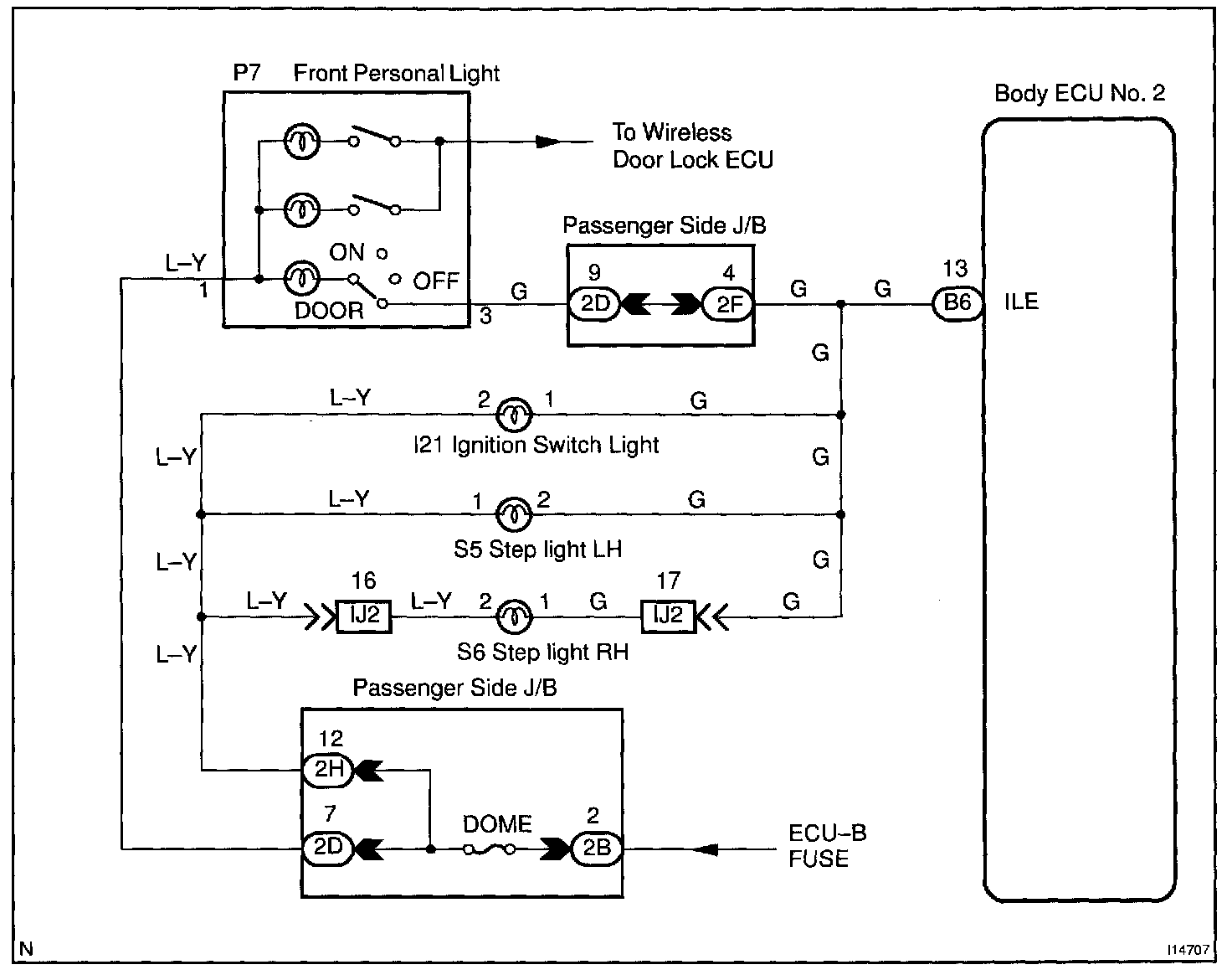 CIRCUIT DESCRIPTIONReceiving the courtesy signal from either of the door ECU, the Body ECU No. 2 will make the interior light, ignition light, and foot light come on.