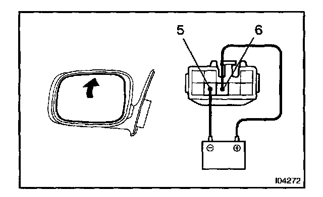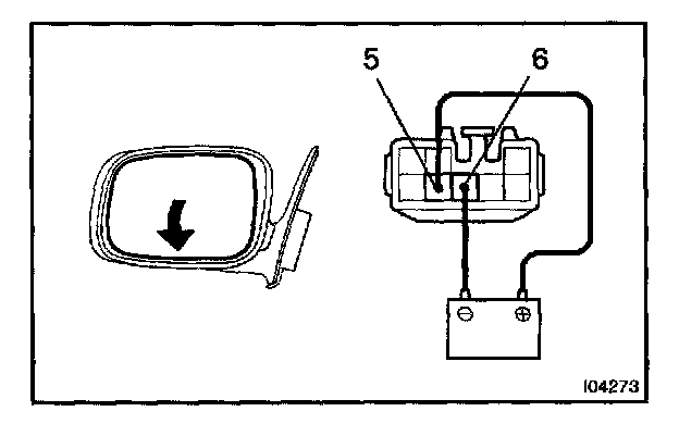 c. Connect the positive (+) lead from the battery to terminal 6 and the negative (-) lead to terminal 5, and check that the mirror turns upward.