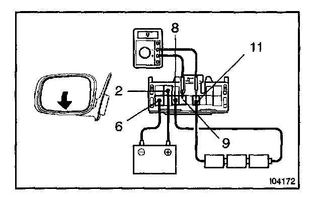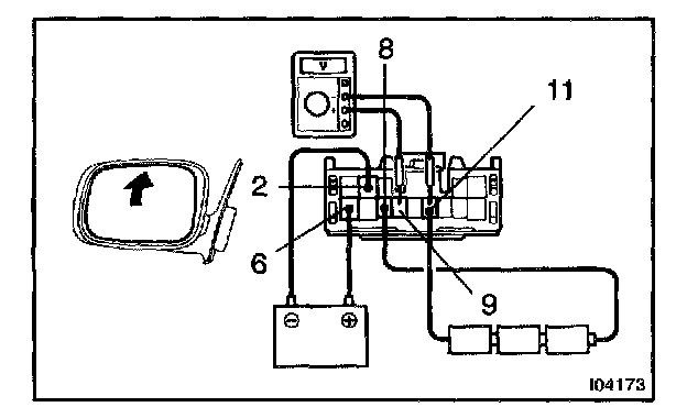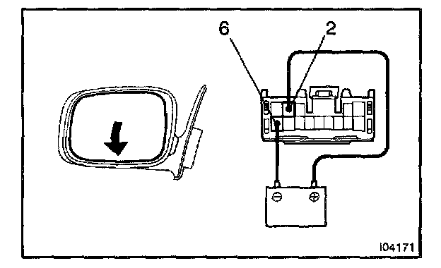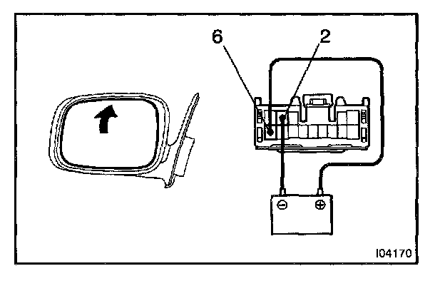 c. Connect the positive (+) lead from the battery to terminal 6 and the negative (-) lead to terminal 2, and check that the mirror turns upward.