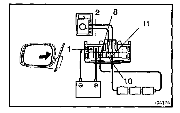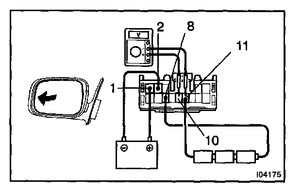 1. Connect the positive (+) lead from the battery to terminal 1 and negative (-) lead to terminal 2, check that the mirror does not operates.