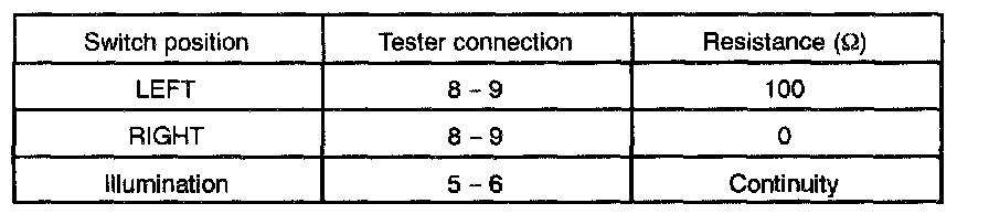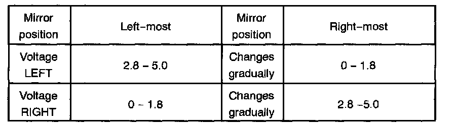 g. Apply battery positive voltage to terminals 1 and 2, then inspect that the voltage gradually changes according to the table below while the mirror moves between the left-most position and right-most position.