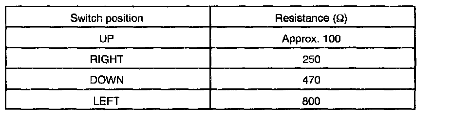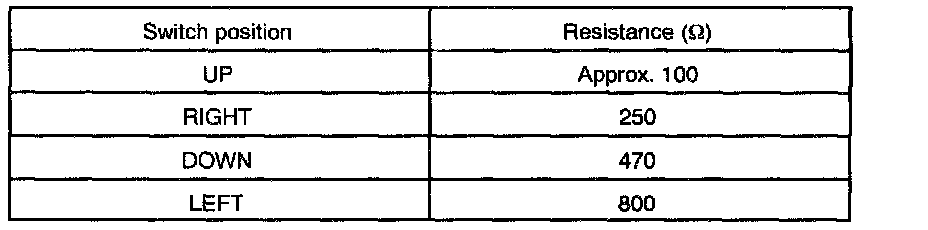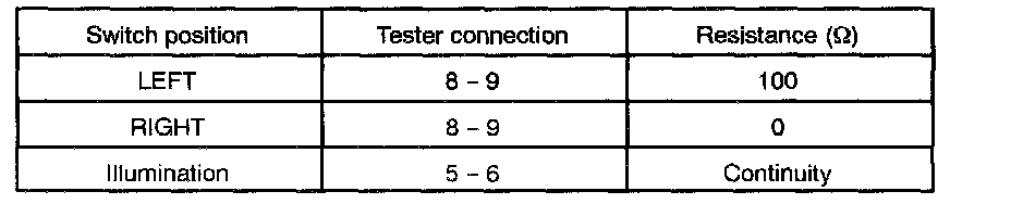 d. Apply battery positive voltage to terminals 2 and 6, then check that the voltage gradually changes according to the table below while the mirror moves between the uppermost position and lowermost position.