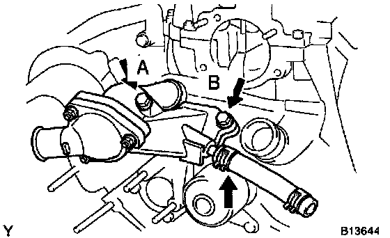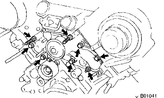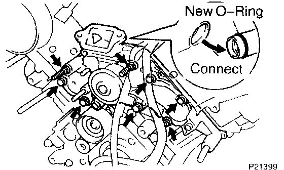 e. Install the water pump with the 5 bolts, 2 stud bolts and nut. Uniformly tighten the bolts, stud bolts and nut in several passes.