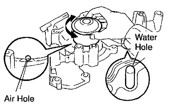 b. Turn the pulley, and check that the water pump bearing moves smoothly and quietly.