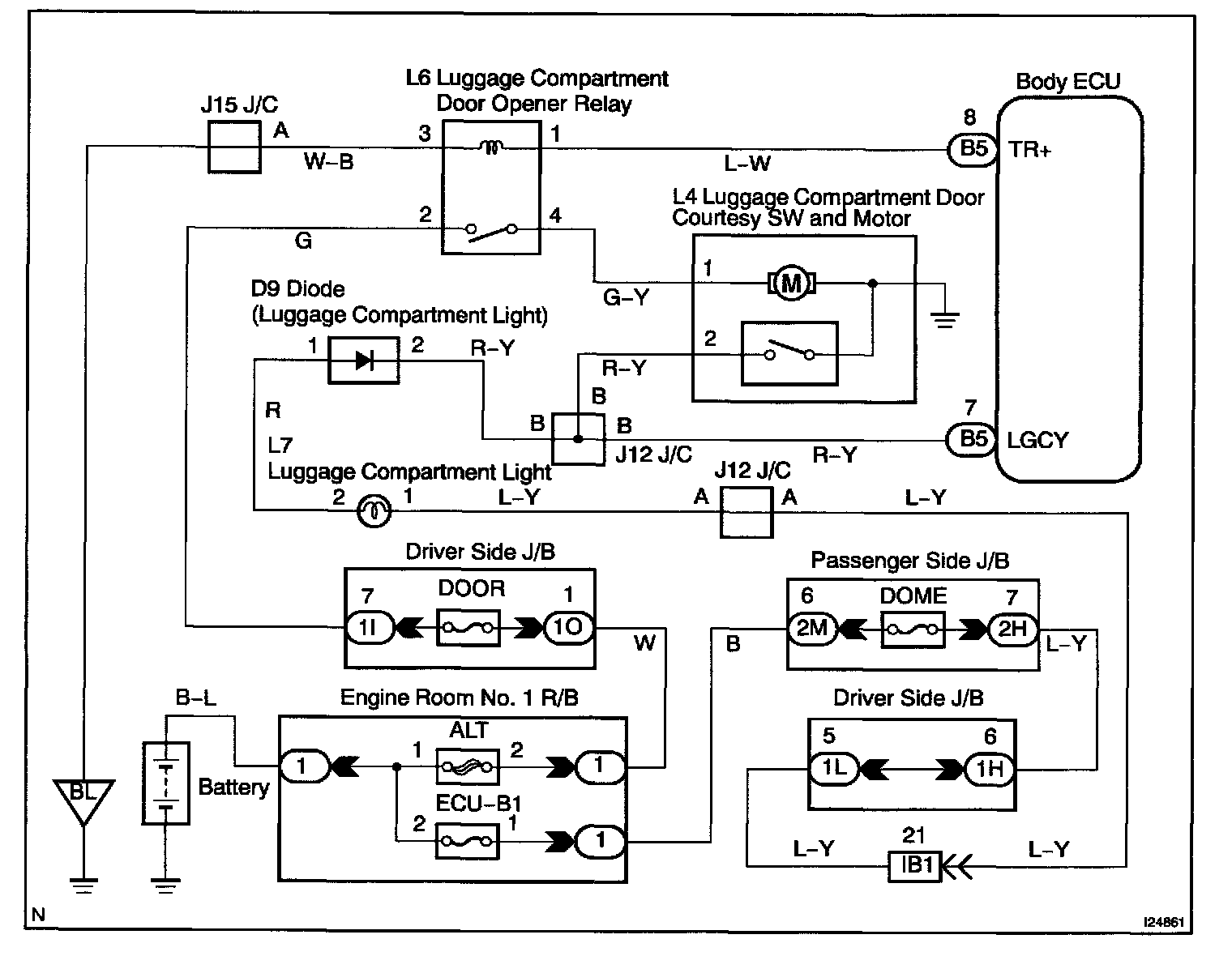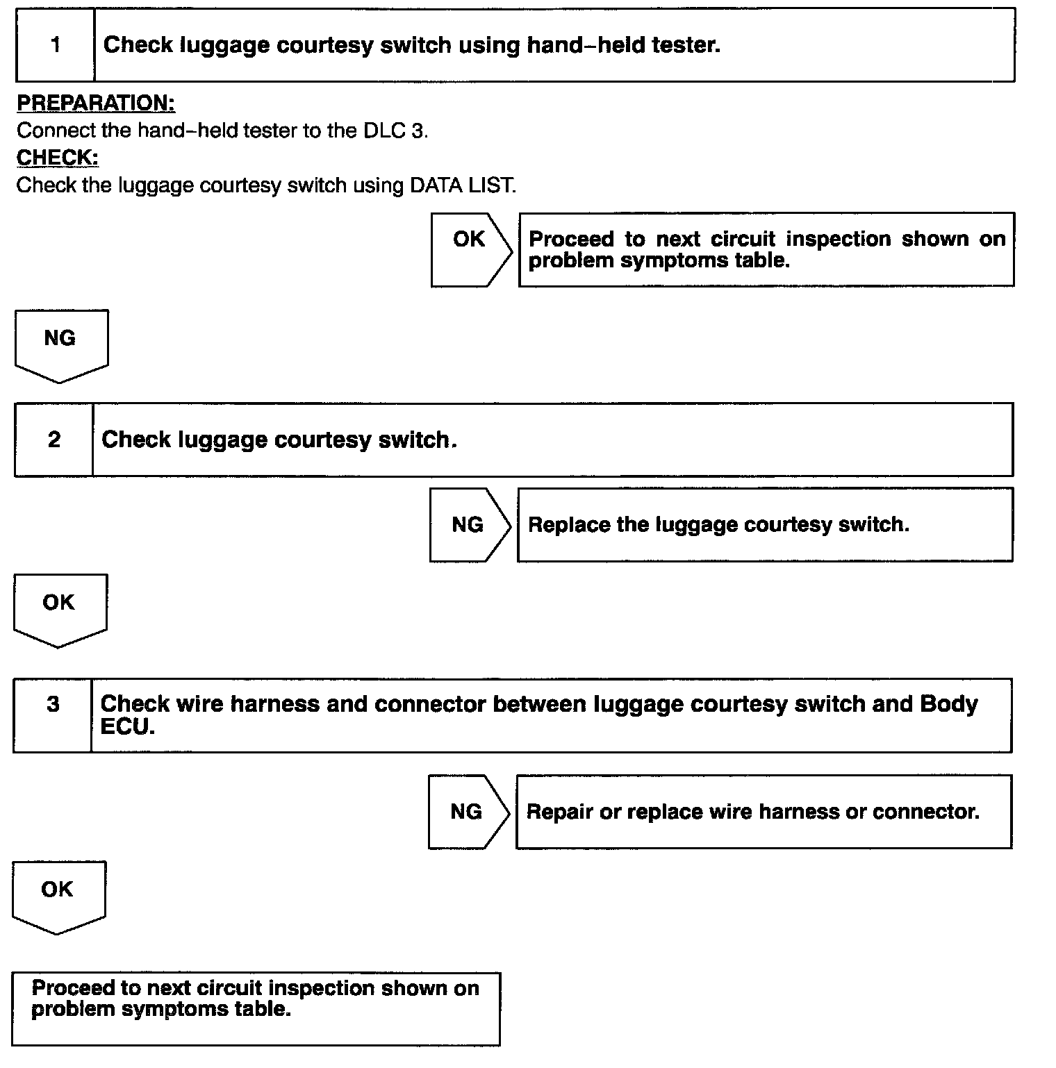 CIRCUIT DESCRIPTIONThe luggage courtesy switch goes on when luggage compartment door is opened and goes off when luggage compartment door is closed.