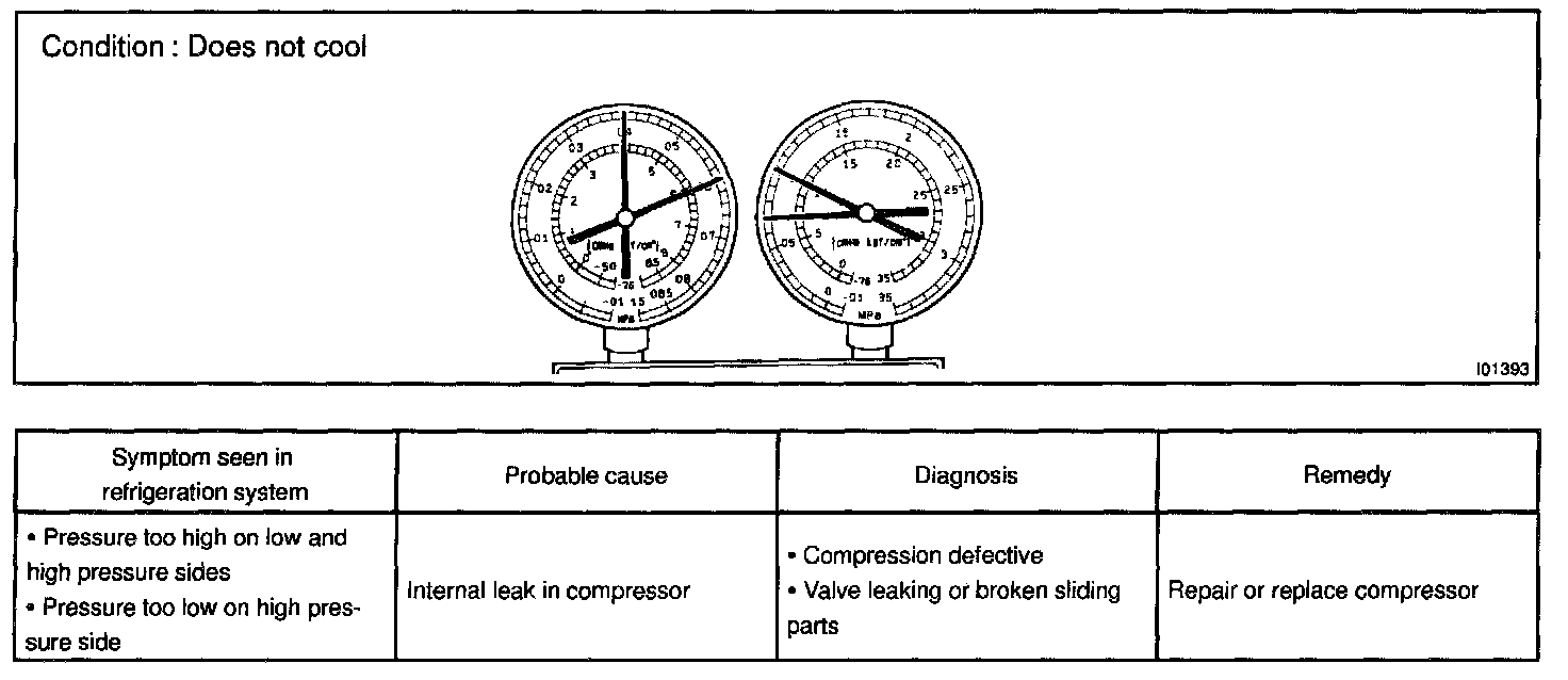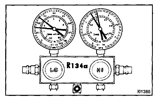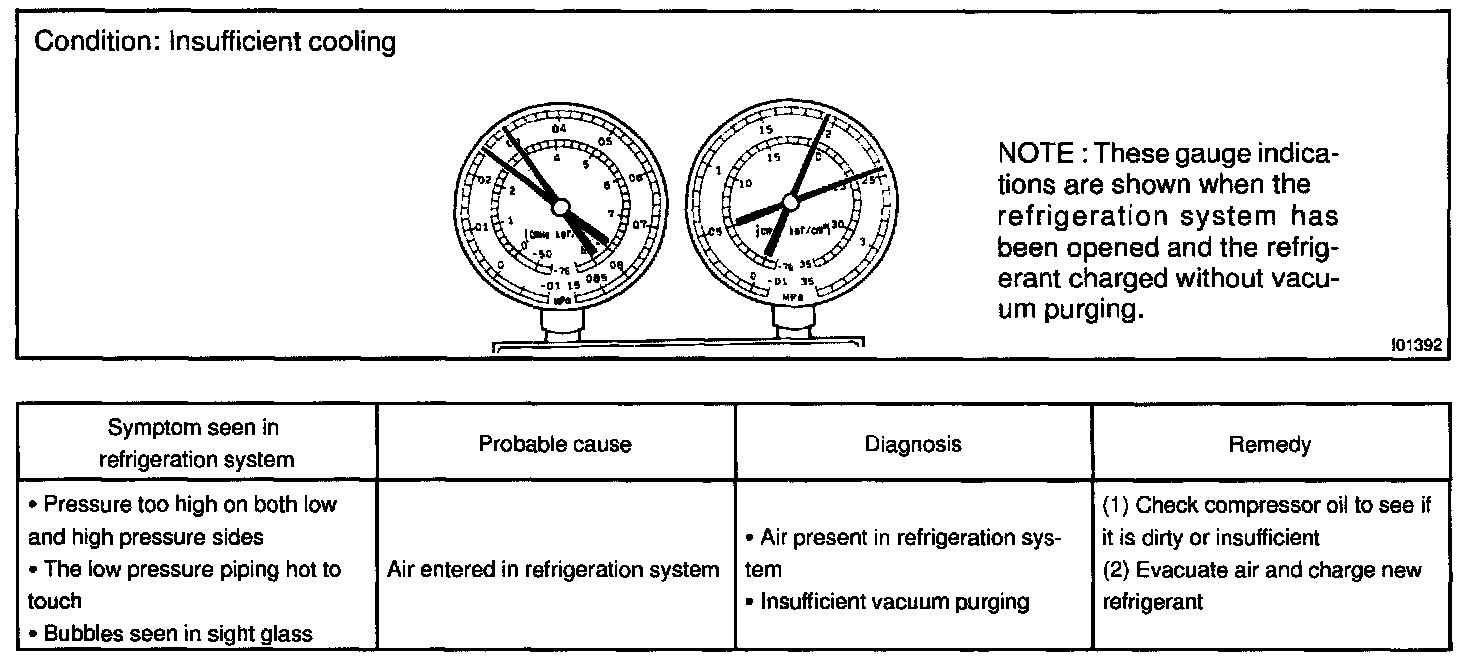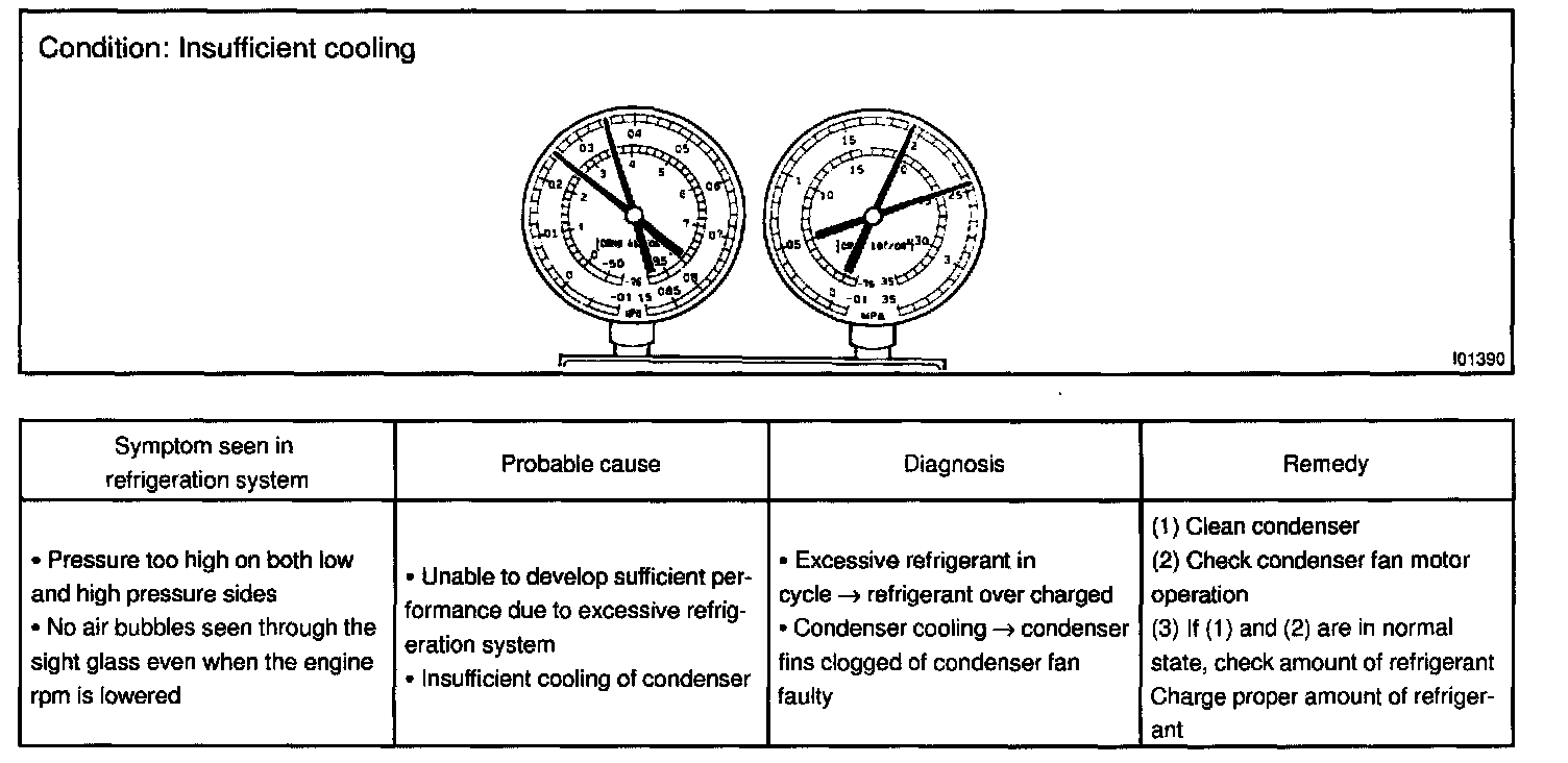This is a method in which the trouble is located by using a manifold gauge set. Read the manifold gauge pressure when these conditions are established.