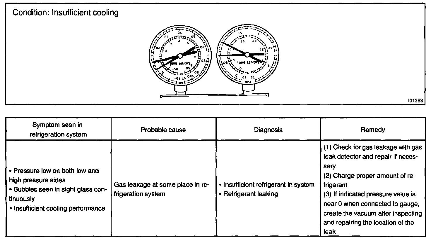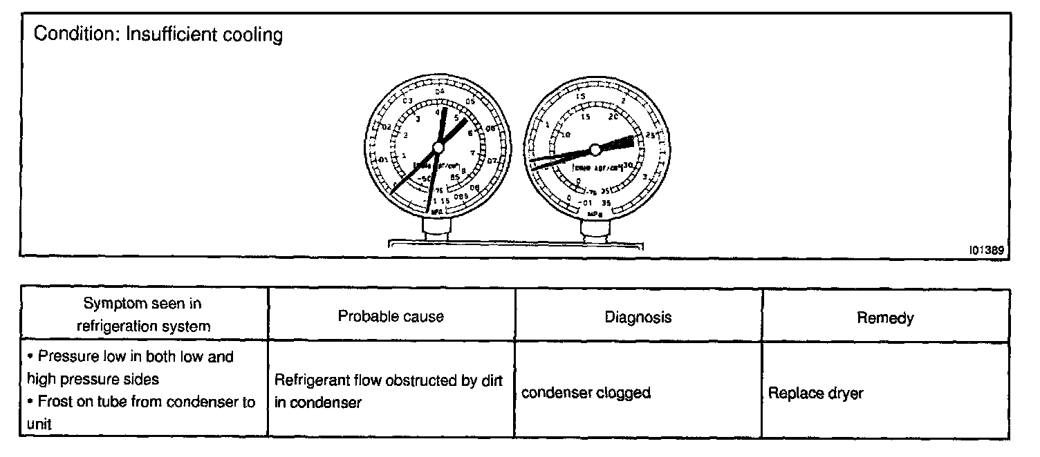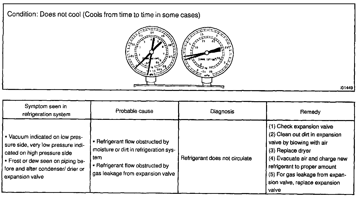 This is a method in which the trouble is located by using a manifold gauge set. Read the manifold gauge pressure when these conditions are established.