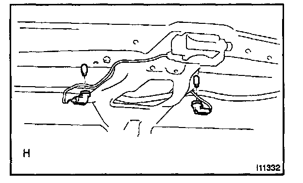 f. Pull the claw towards the inside of the vehicle as shown in the illustration, disconnect the engagement of 2 claws, and remove the license plate light assembly.