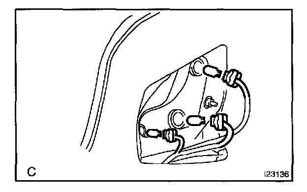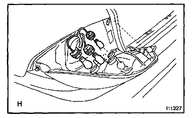 f. From the inside of the luggage room, separate the connector and disconnect the LH rear combination light assembly.