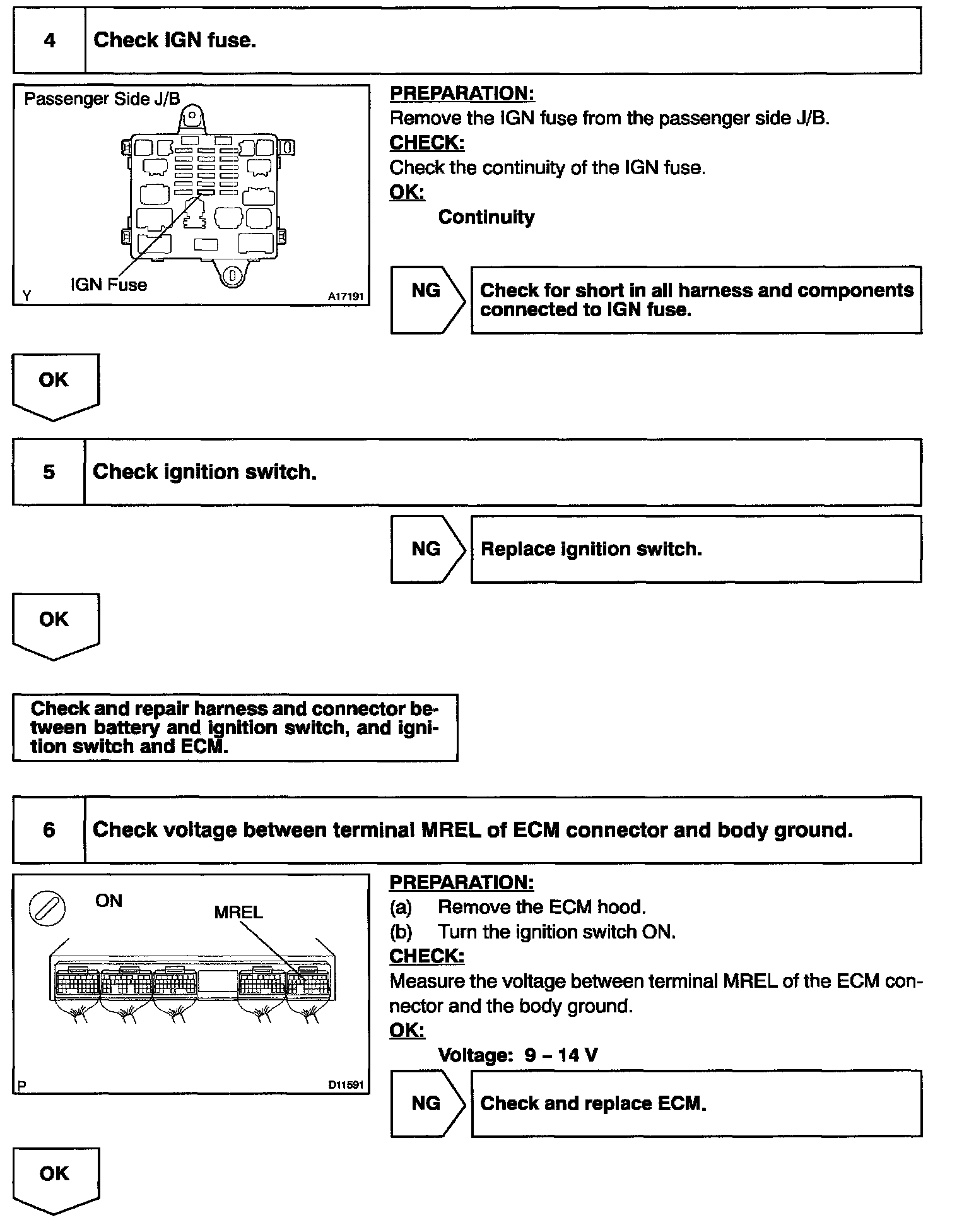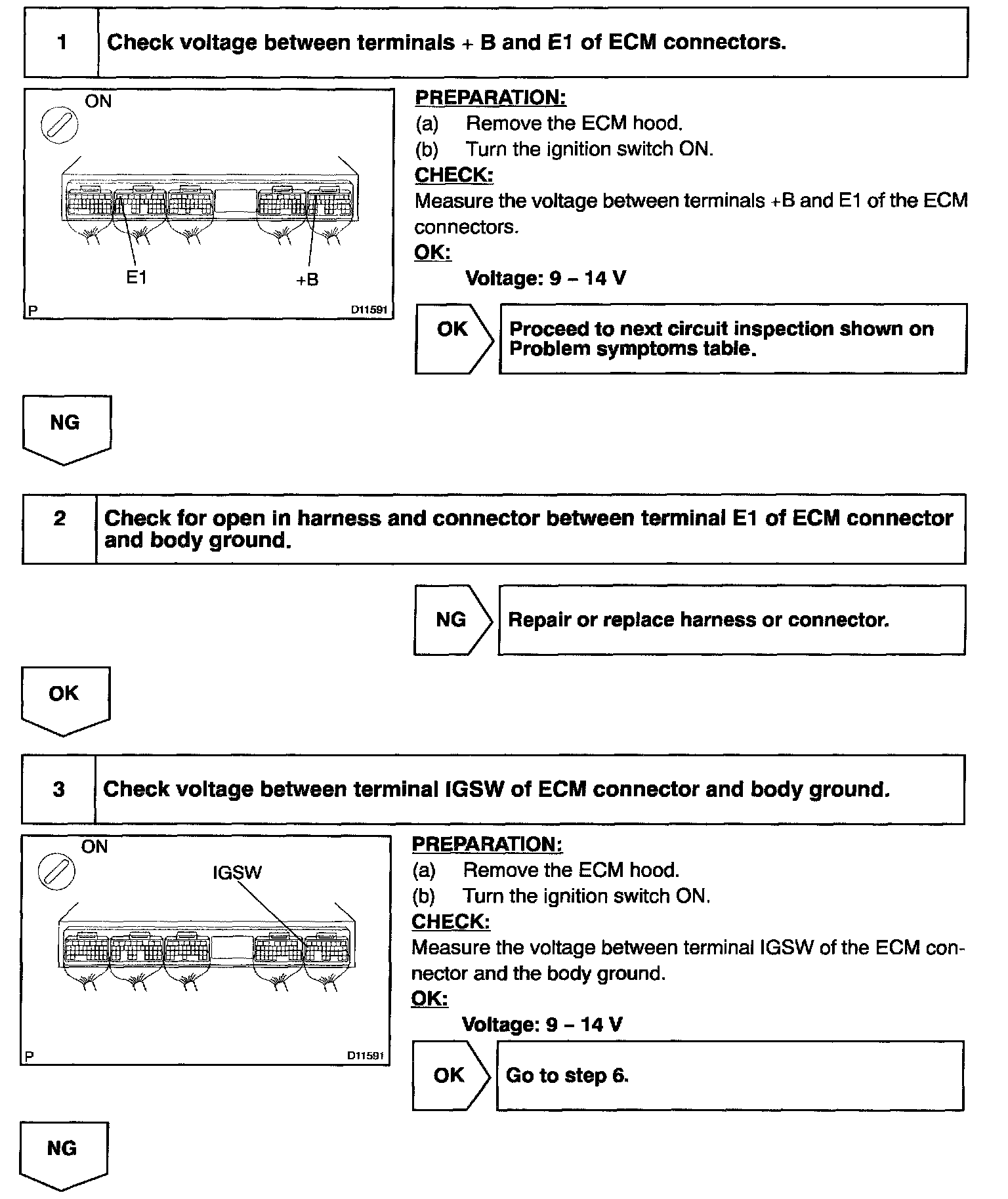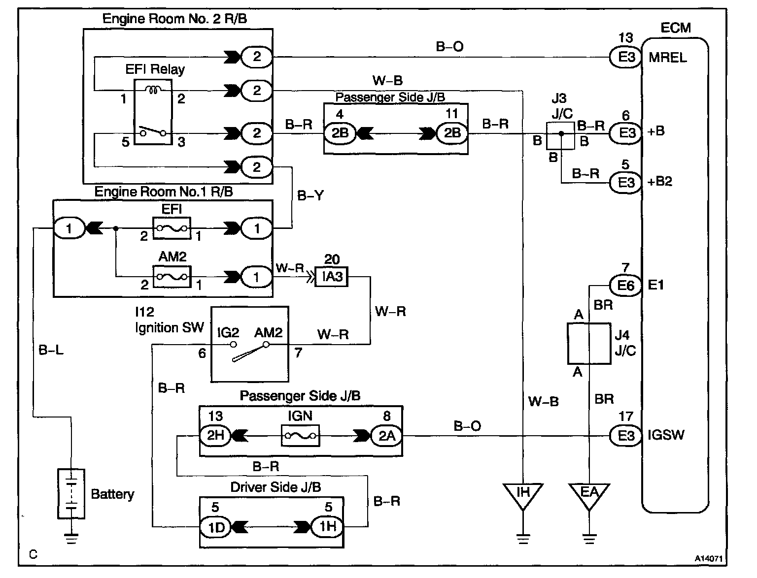This signal causes current to flow to the coil, closing the contacts of the EFI main relay and supplying power to terminals +B and B2 of the ECM.