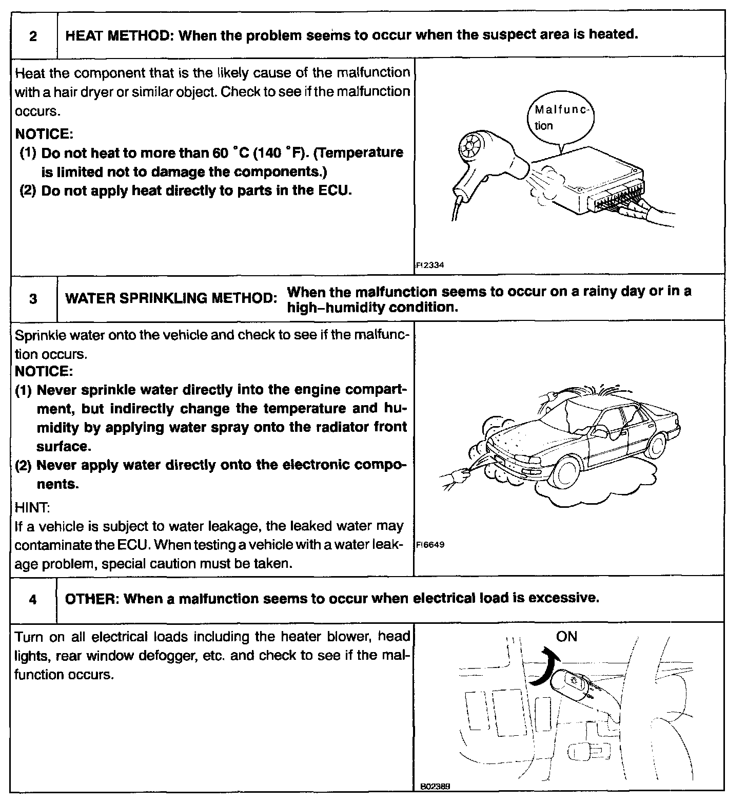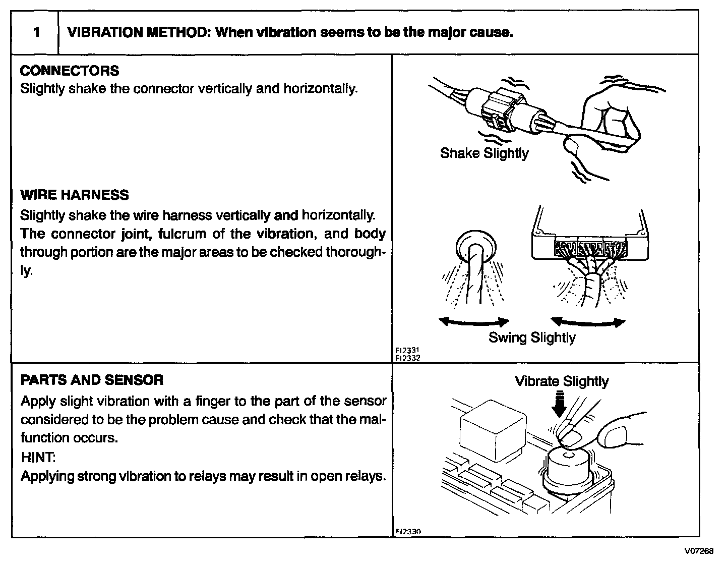 The most difficult case in troubleshooting is when there are no problem symptoms occurring. In such cases, a thorough customer problem analysis must be carried out, then simulate the same or similar conditions and environment in which the problem occurred in the customer's vehicle. No matter how much experience a technician has, or how skilled he may be, if he proceeds to troubleshoot without confirming the problem symptoms he will tend to overlook something important in the repair operation and make a wrong guess somewhere, which will only lead to a standstill. For example, for a problem which only occurs when the engine is cold, or for a problem which occurs due to vibration caused by the road during driving, etc., the problem can never be determined so long as the symptoms are confirmed with the engine hot condition or the vehicle at a standstill. Since vibration, heat or water penetration (moisture) is likely cause for problem which is difficult to reproduce, the symptom simulation tests introduced here are effective measures in that the external causes are applied to the vehicle in a stopped condition.