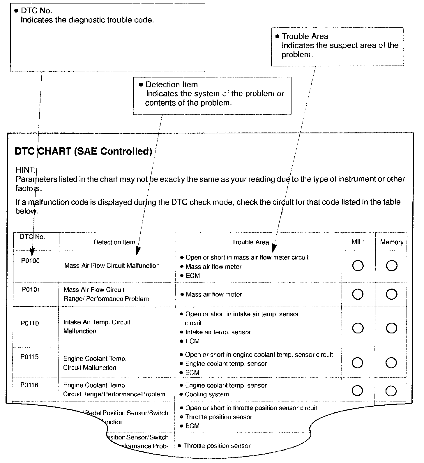 DIAGNOSTIC TROUBLE CODE CHARTThe inspection procedure is shown in the table. This table permits
