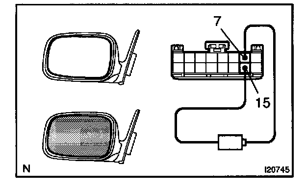 b. Connect the positive (+) lead from the dry through battery to terminal 7 and the negative (-) lead to terminal 15, then check that the mirror surface become "dark".