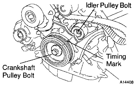 Check that the timing mark of the crankshaft pulley is in aligned with the centers of the crankshaft pulley bolt and No.2 timing belt idler pulley bolt.