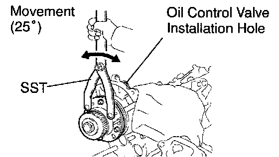 Using SST, rotate the camshaft timing tube from left to right 2 to 3 times within its VVT-i range of movement (25°) and use a waste cloth to collect the oil from the camshaft timing oil control valve installation hole.
