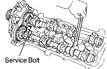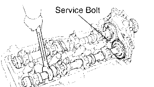 1. Boring the service bolt hole of the sub-gear upward by turning the hexagon wrench head portion of the exhaust camshaft with a wrench.
