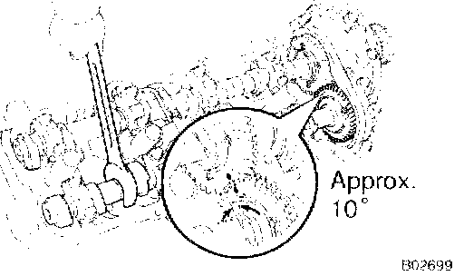 3. Set the timing mark (1 dot mark) of the camshaft main gear at approx. 10° angle by turning the hexagon wrench head portion of the exhaust camshaft with a wrench