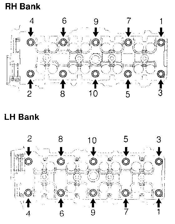 g. Uniformly loosen the 10 cylinder head bolts on one side of each cylinder head in several passes, in the sequence shown, then do the other side as shown. Remove the 20 cylinder head bolts and plate washers.