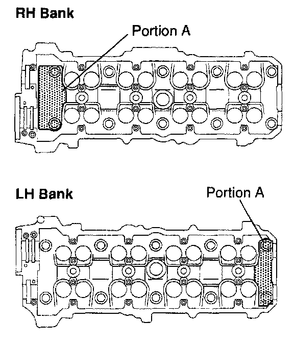 ^ Do not drop the plate washer for cylinder head bolt into portion A of the cylinder head. If dropped into portion A, the plate washer will pass through the cylinder head and cylinder block into the oil pan.