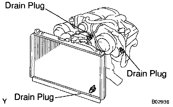 b. Remove the 3 drain plugs on the engine and radiator, and drain the coolant.