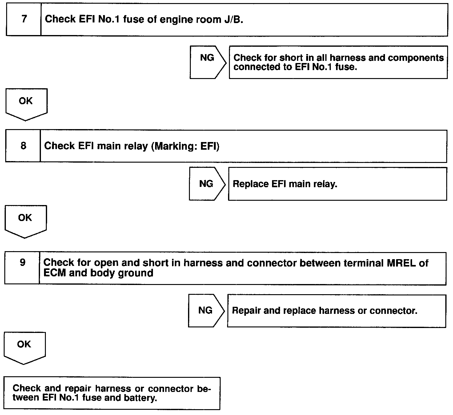 This signal causes current to flow to the coil, closing the contacts of the EFI main relay and supplying power to terminal +B of the ECM