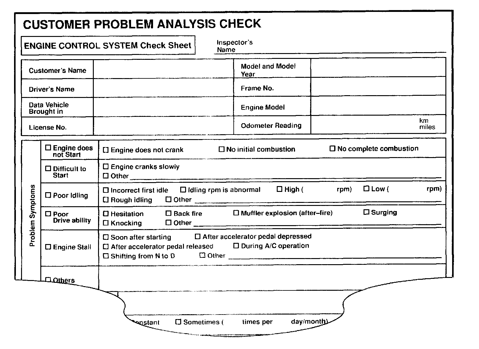 CUSTOMER PROBLEM ANALYSISIn troubleshooting the problem symptoms must be confirmed accurately and all preconceptions must be cleared away in order to give an accurate judgment. To ascertain just what the problem symptoms are, it is extremely important to ask the customer about the problem and the conditions at the time it occurred.