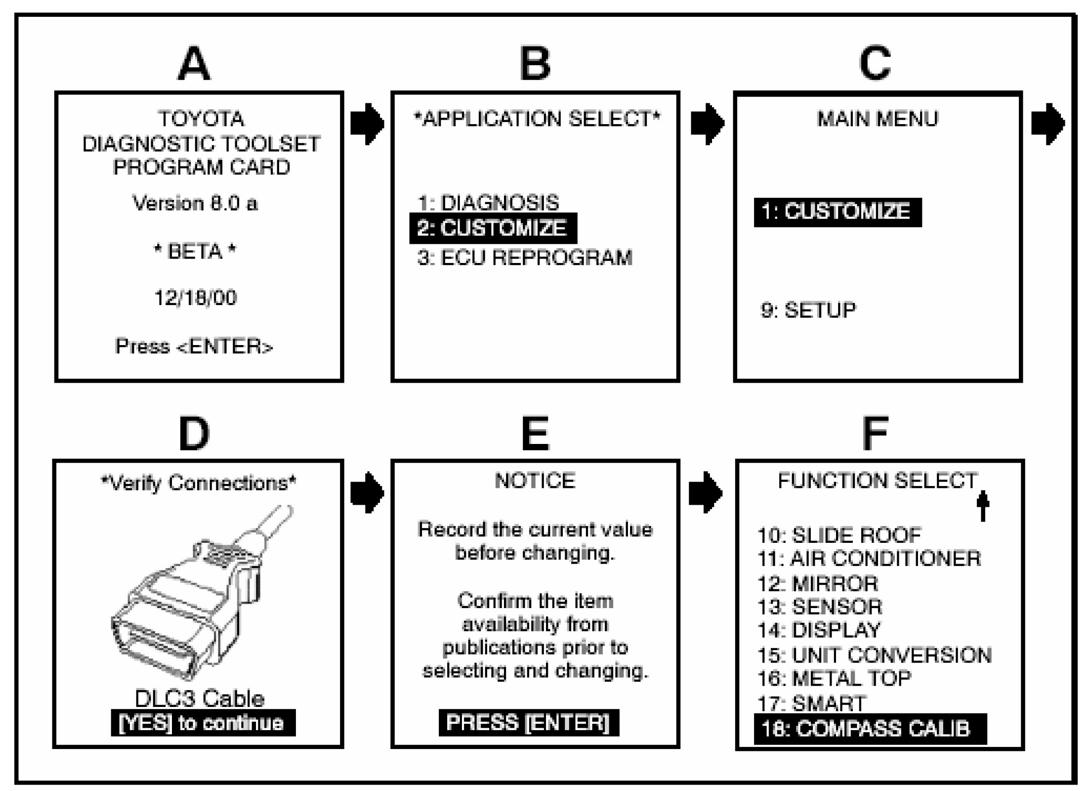 1. Using the Lexus Diagnostic Scan Tool (see illustration) go to the "Customize" menu and select the "Compass Calib".