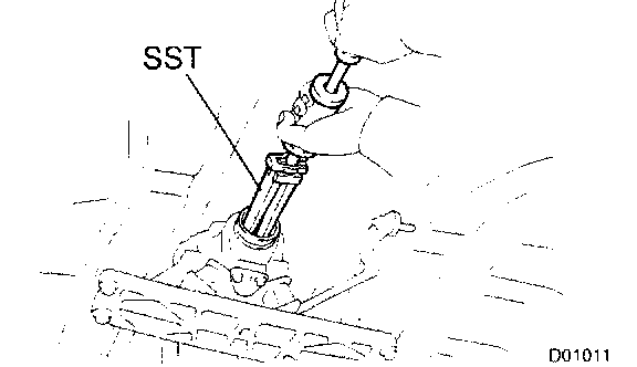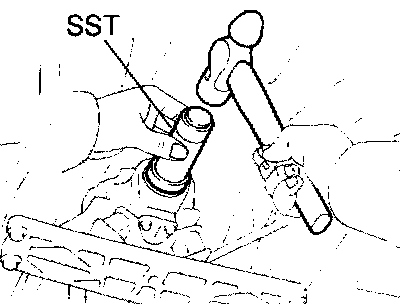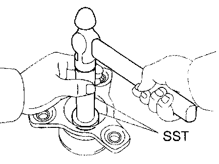 b. Using SST and a hammer, drive in the oil seal with the lip facing downward.