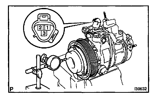 b. Connect the battery positive lead to the terminal 3 of magnet clutch connector and the negative lead to the earth wire. Turn on and off the magnet clutch and measure the clearance.