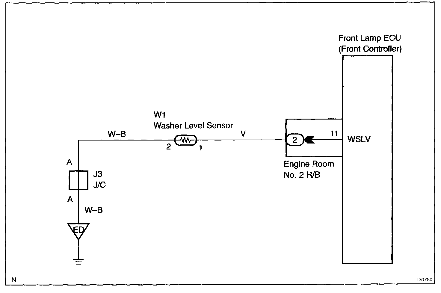 CIRCUIT DESCRIPTIONFront lamp ECU receives washer fluid level sensor information, and sends it through the multiplex communication circuit to the combination meter.