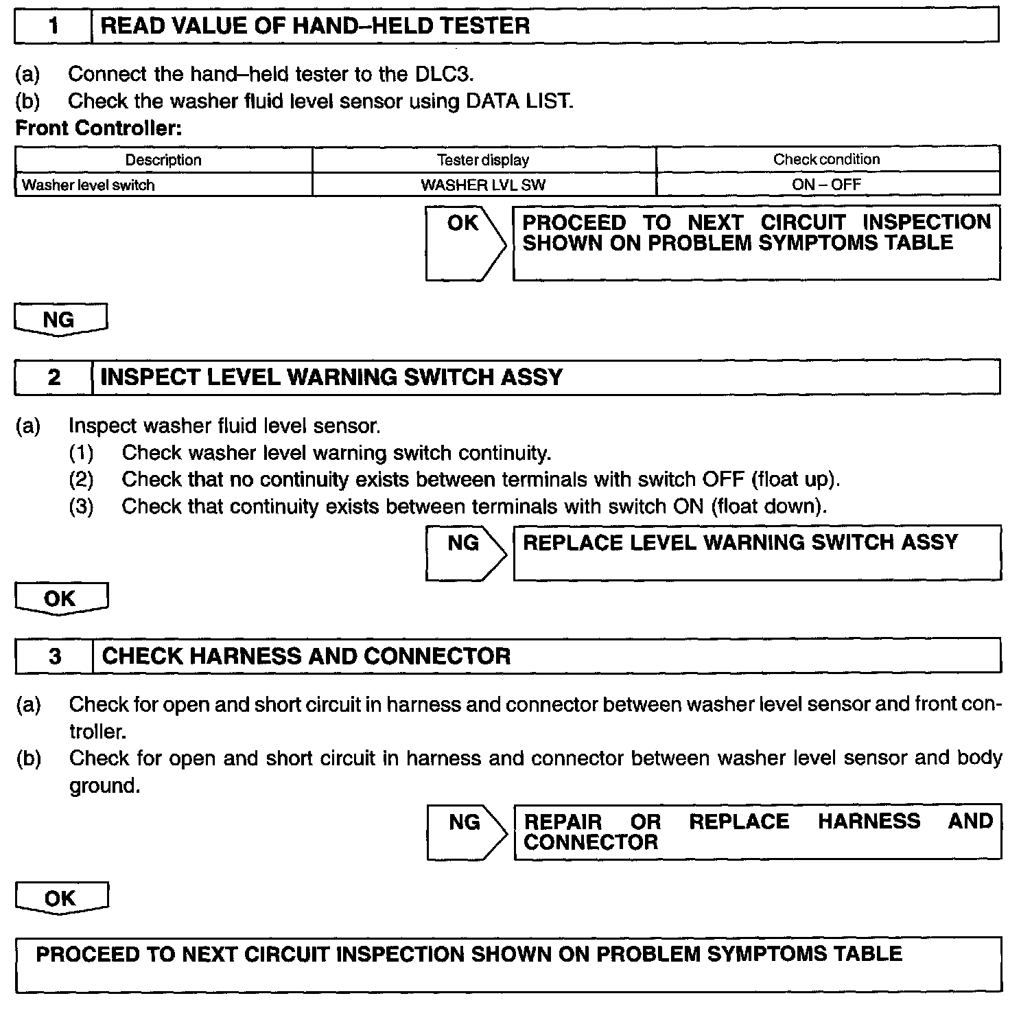 The combination meter receives this information, and lights the washer fluid level warning when the washer fluid becomes less.