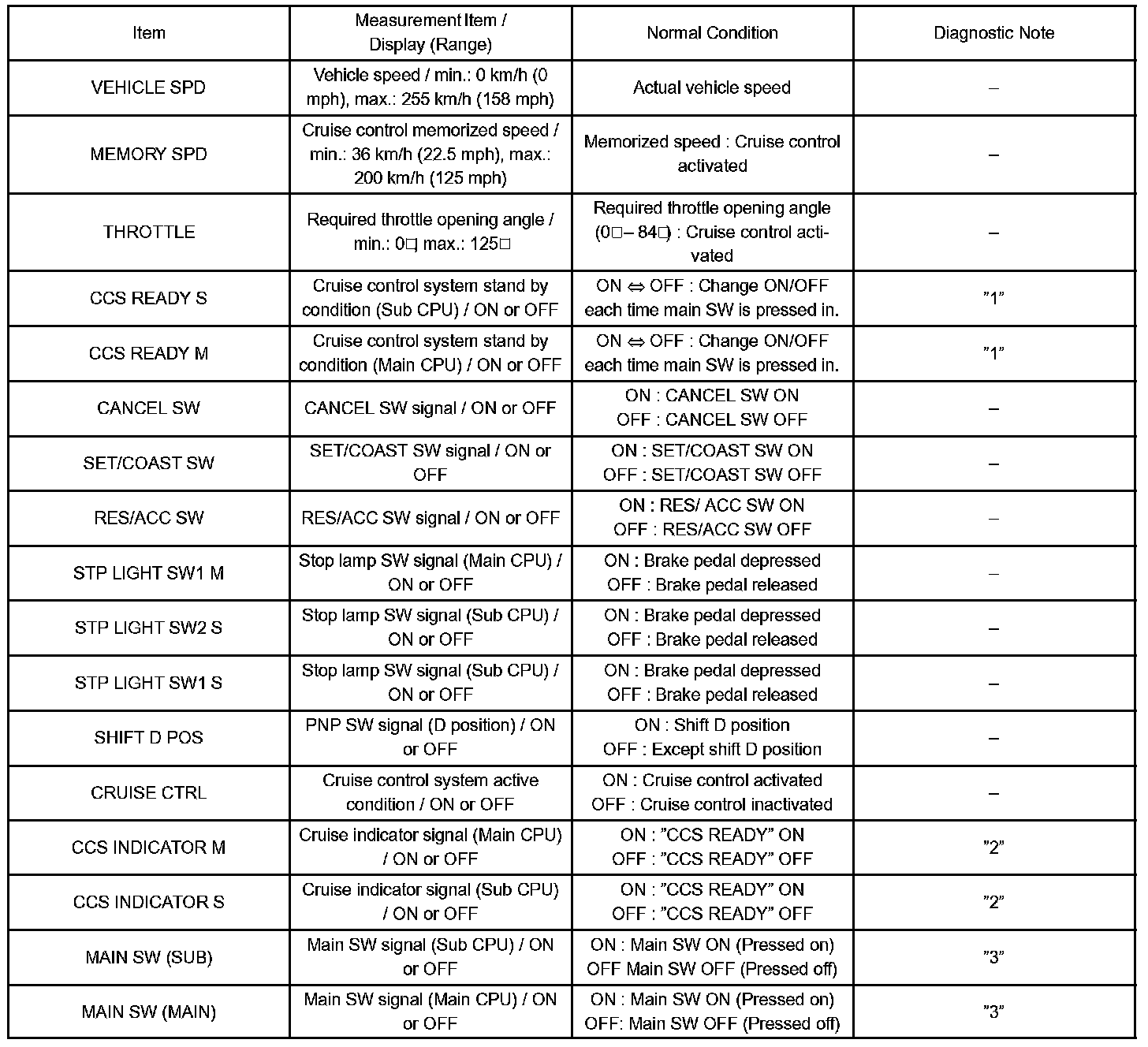 "3" is OK but the cruise indicator does not come on -> CRUISE MAIN indicator, wire harness or ECM failure