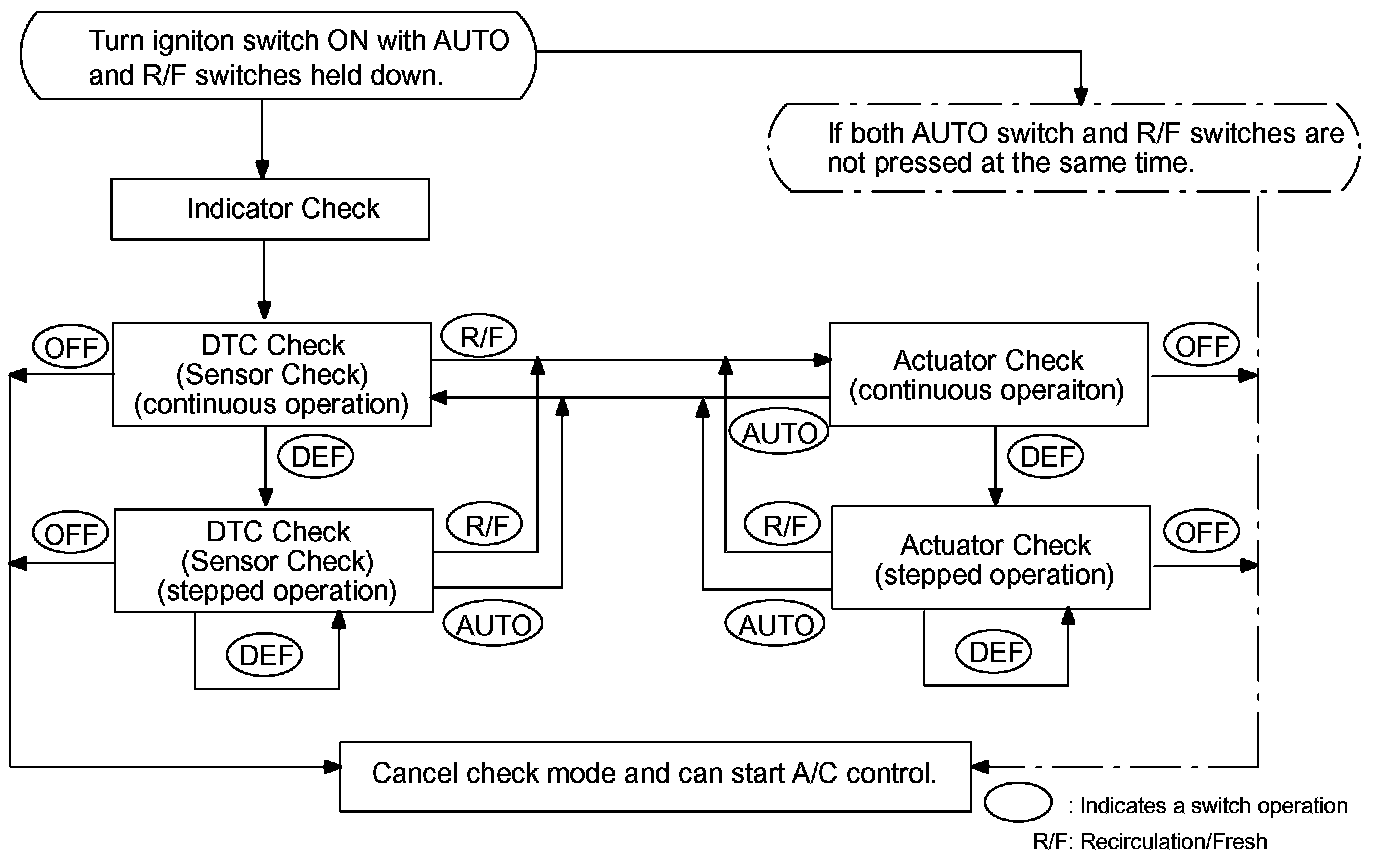 LIST OF OPERATION METHODSBy operating each of the A/C control switches as shown the diagram, it is possible to enter the diagnosis check mode.
