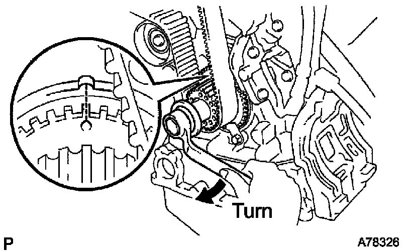 g. Turn the crankshaft, then align the timing mark of the crankshaft timing pulley with the oil pump body.