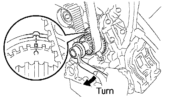 NOTICE: If the timing belt is disengaged, having the crankshaft pulley set at the wrong angle can cause contact of the piston head with the valve head when removing the camshaft timing pulley and camshaft, which causes damage. So always set the crankshaft pulley at the correct angle.