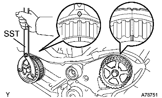f. Using SST, turn the timing pulleys, then align the timing marks of the timing pulleys with the timing belt No. 3 cover.