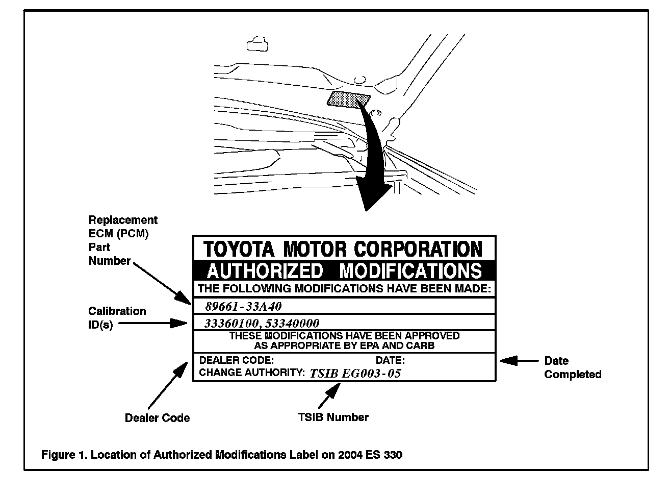 2. Check for the Authorized Modifications Label affixed to the vehicle in the location shown in Figure 1. Confirm if ECM (PCM) calibration has been updated. If not the latest ECM (PCM) calibration go to step 3.