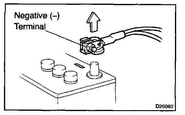 1. Before performing electrical work, disconnect the battery negative (-) terminal cable beforehand so as to prevent burnt-out damage by short.