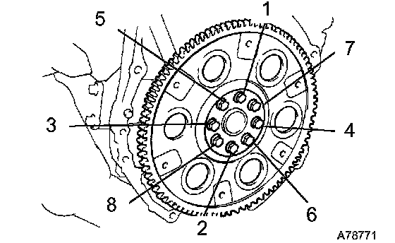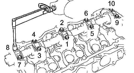 Using several steps, loosen the 8 cylinder head bolts uniformly in the sequence shown in the illustration. Remove the 8 cylinder head bolts and plate washers